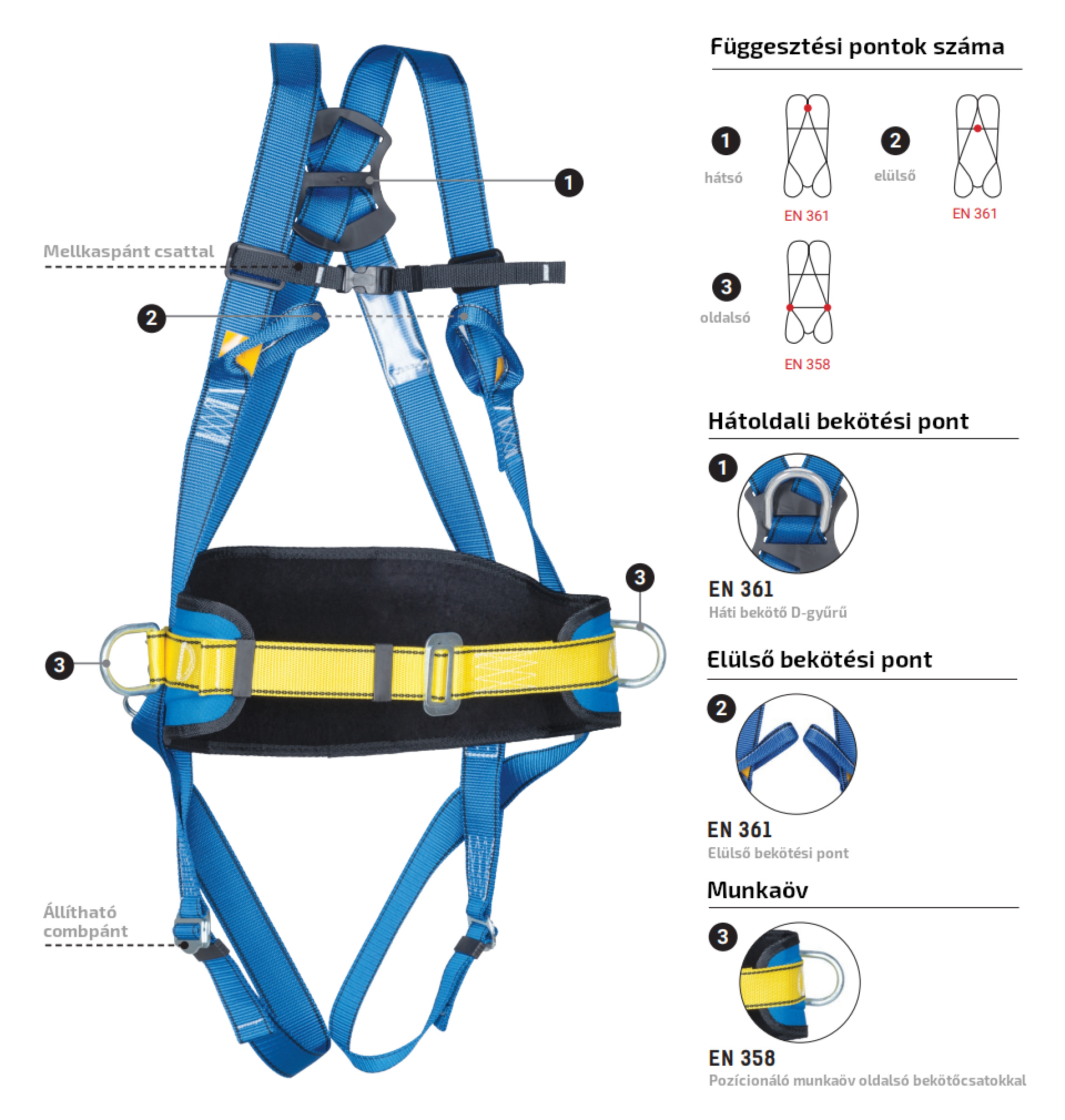 A termék 44 mm széles, poliészter alapanyagú hevederekkel készül, amelyek a váll-, comb- és derékrészen egyaránt állíthatók, így pontosan a felhasználó méretéhez igazíthatók. A biztonságos bekötést egy hátsó, D alakú acél bekötési pont (EN 361), valamint két elülső hevederhurok biztosítja (EN 361). A munkahelyzet-beállító (pozicionáló) deréköv két fém bekötési ponttal rendelkezik (EN 358), mérete szabályozható. A komfort-párnázat és a beülős fenékheveder kényelmesebb, hosszabb idejű munkavégzést tesz lehetővé. A mellrészen 25 mm széles, csatos rögzítés gondoskodik a stabil illeszkedésről. A termék tömege 1300 g. Amennyiben a megfelelő termék kiválasztásával, műszaki alkalmasságával kapcsolatban kérdése van, forduljon szakembereinkhez! Telefon: 06 (52) 316-319