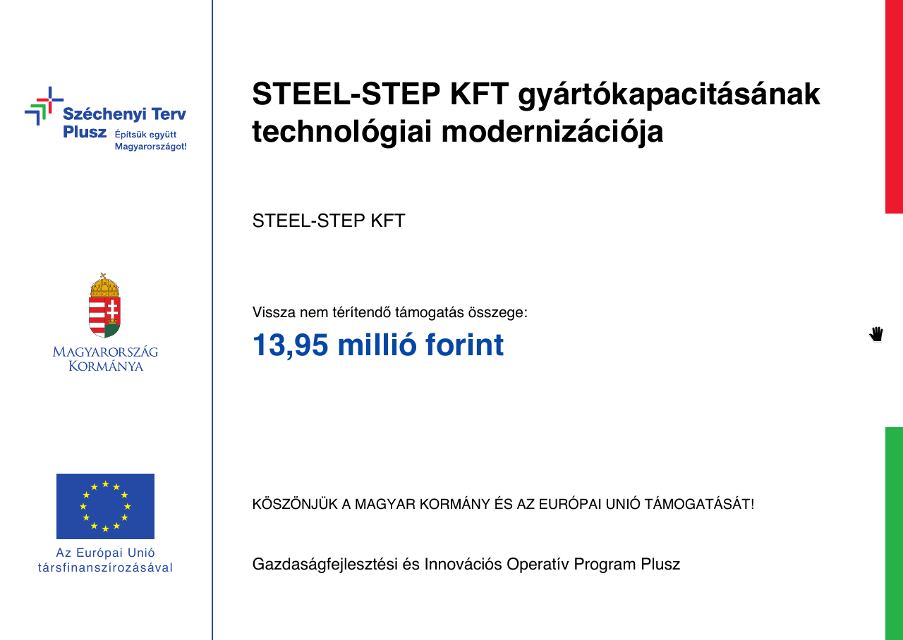A Steel-Step Kft (4030 Debrecen, Diószegi út 22.2.) a Széchenyi Terv Plusz program GINOP_PLUSZ-1.2.4-25 kódszámú „Mikro- és kisvállalkozások támogatása a leghátrányosabb helyzetű régiókban, illetve a Szabad Vállalkozási Zónákban” című pályázatának nyerteseként kötélárú gyártás tevékenységének végzéséhez kapcsolódó eszközbeszerzést valósít meg, 13,95 millió forint vissza nem térítendő európai uniós támogatás segítségével.